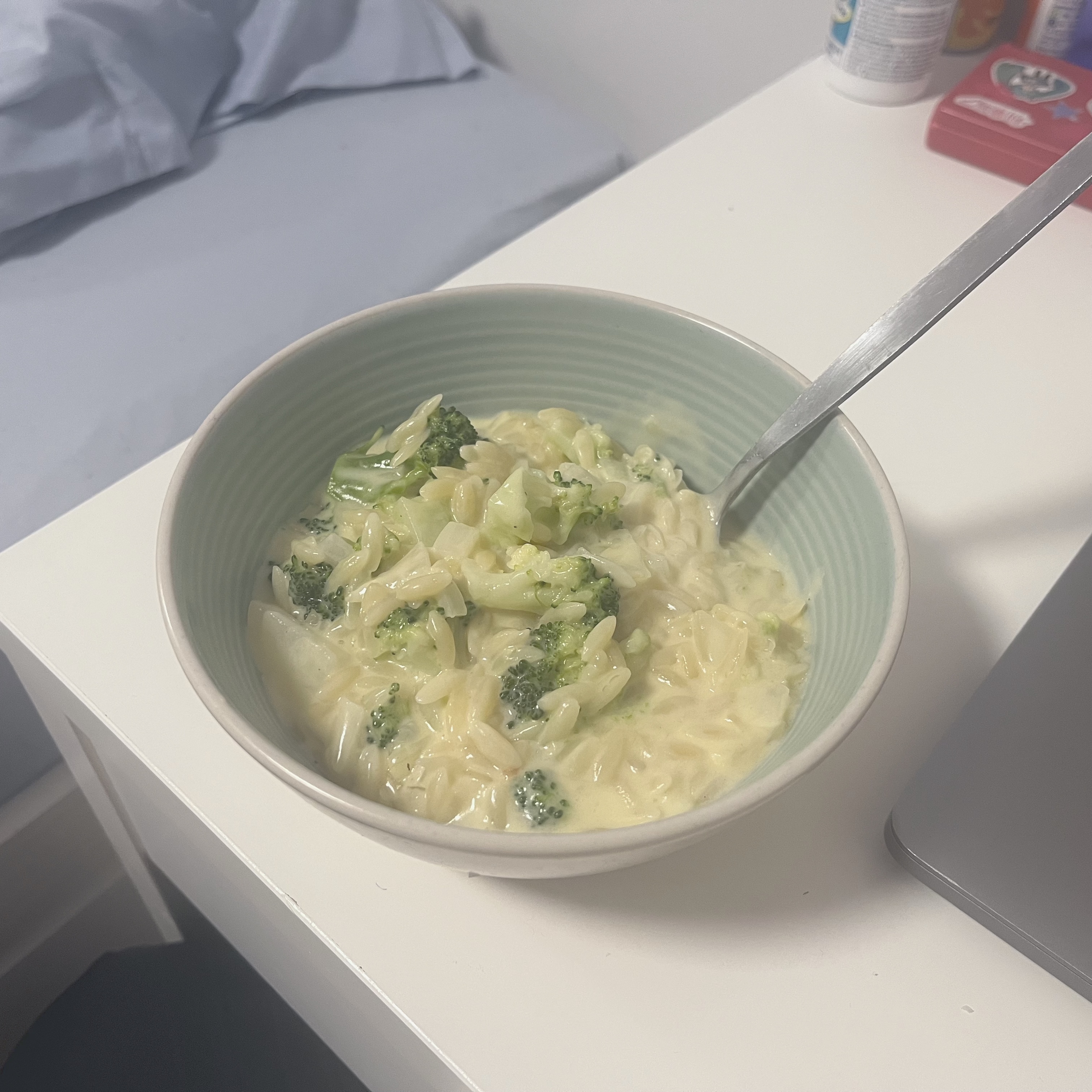 this was the first meal i made with an actual recipe so i was very biased in favor of it. i need to have some sort of vegetable in every meal i eat or else i go crazy, so i figured this would be yummy and also satisfy my dark fears of malnutrition. it did not disappoint! broccoli and cheddar is always a nice combo, and i love orzo as a pasta shape. i did not exactly measure the cheese, but i think i put in significantly more than the recipe called for. it's ok.